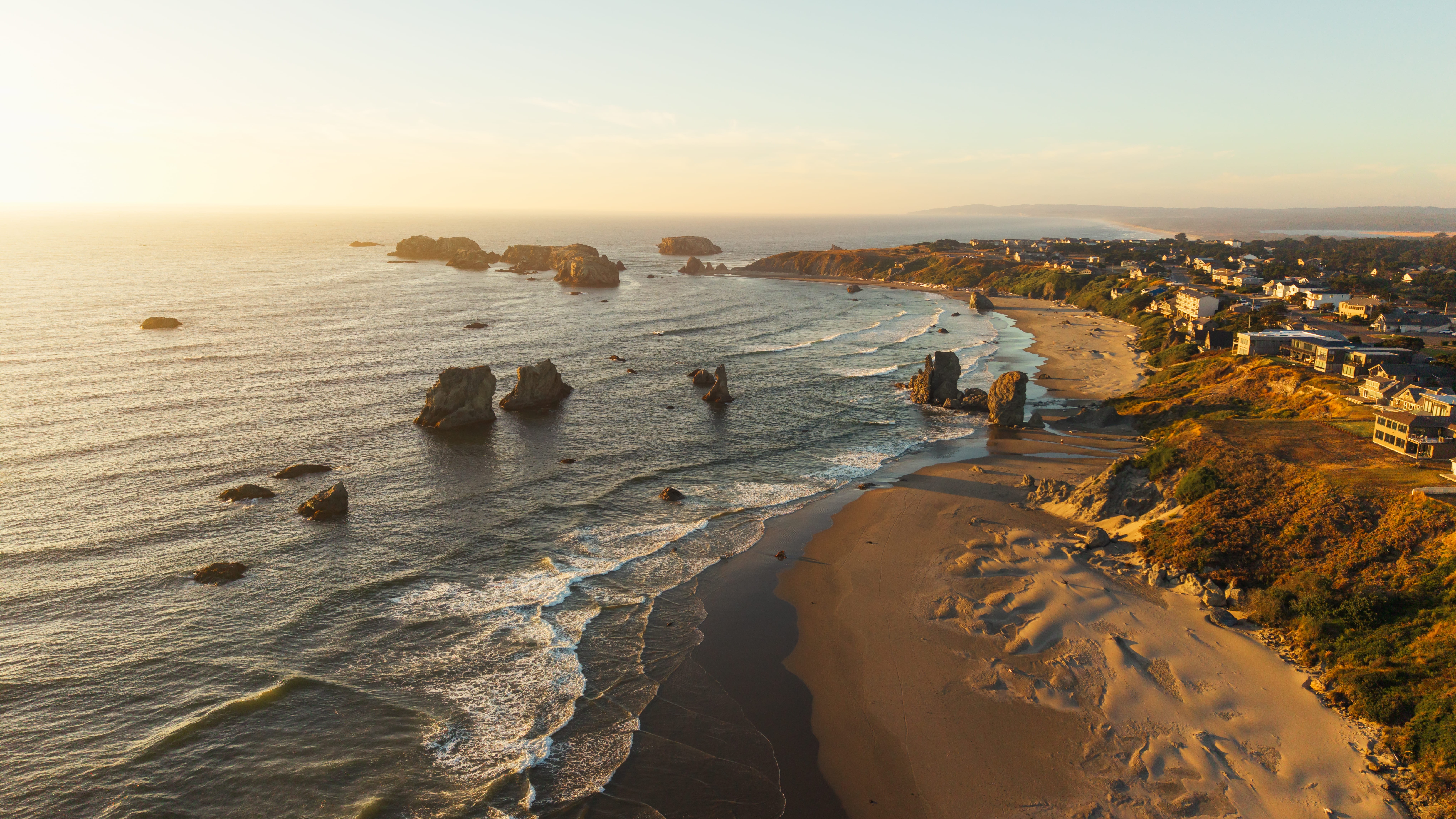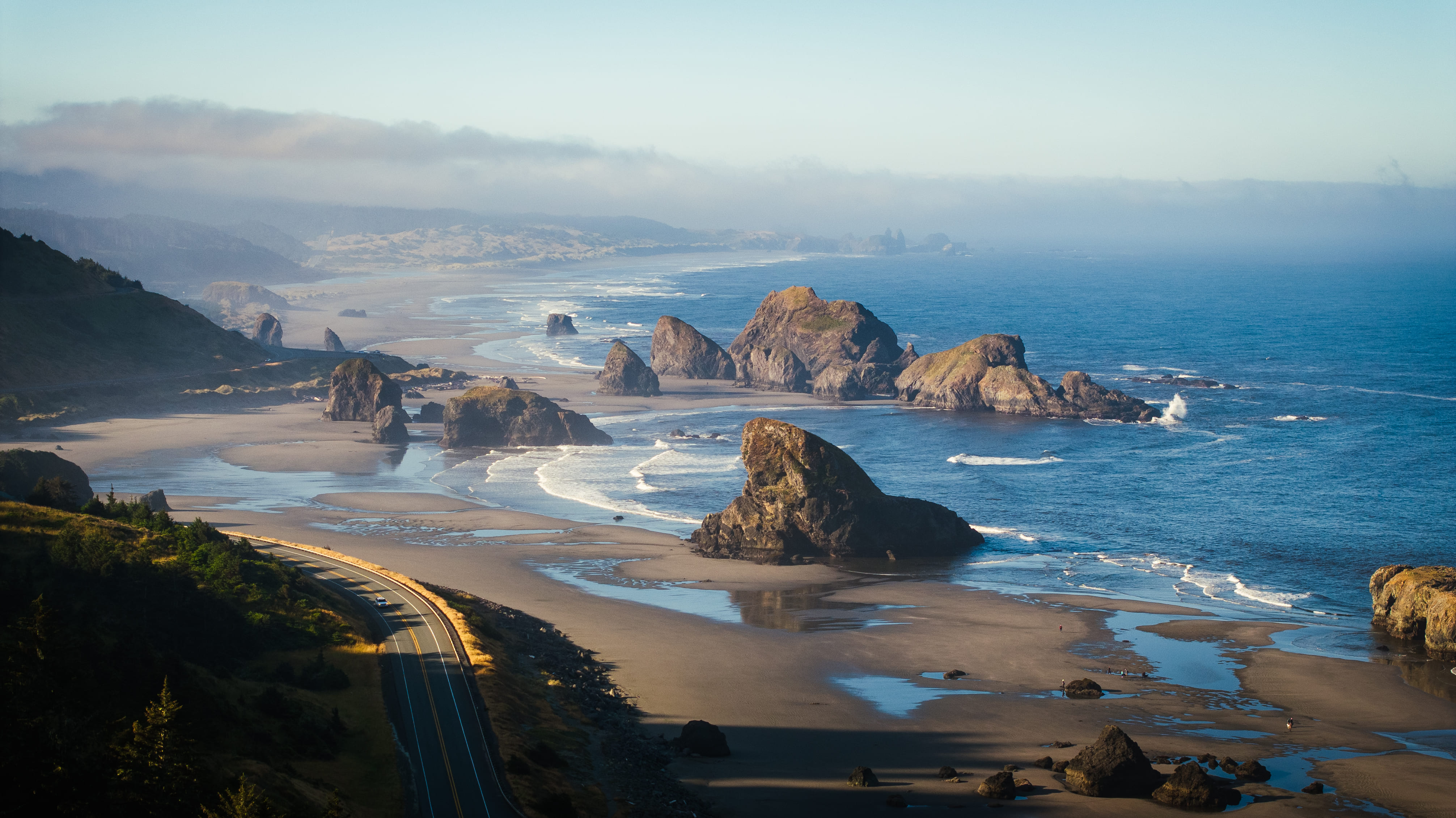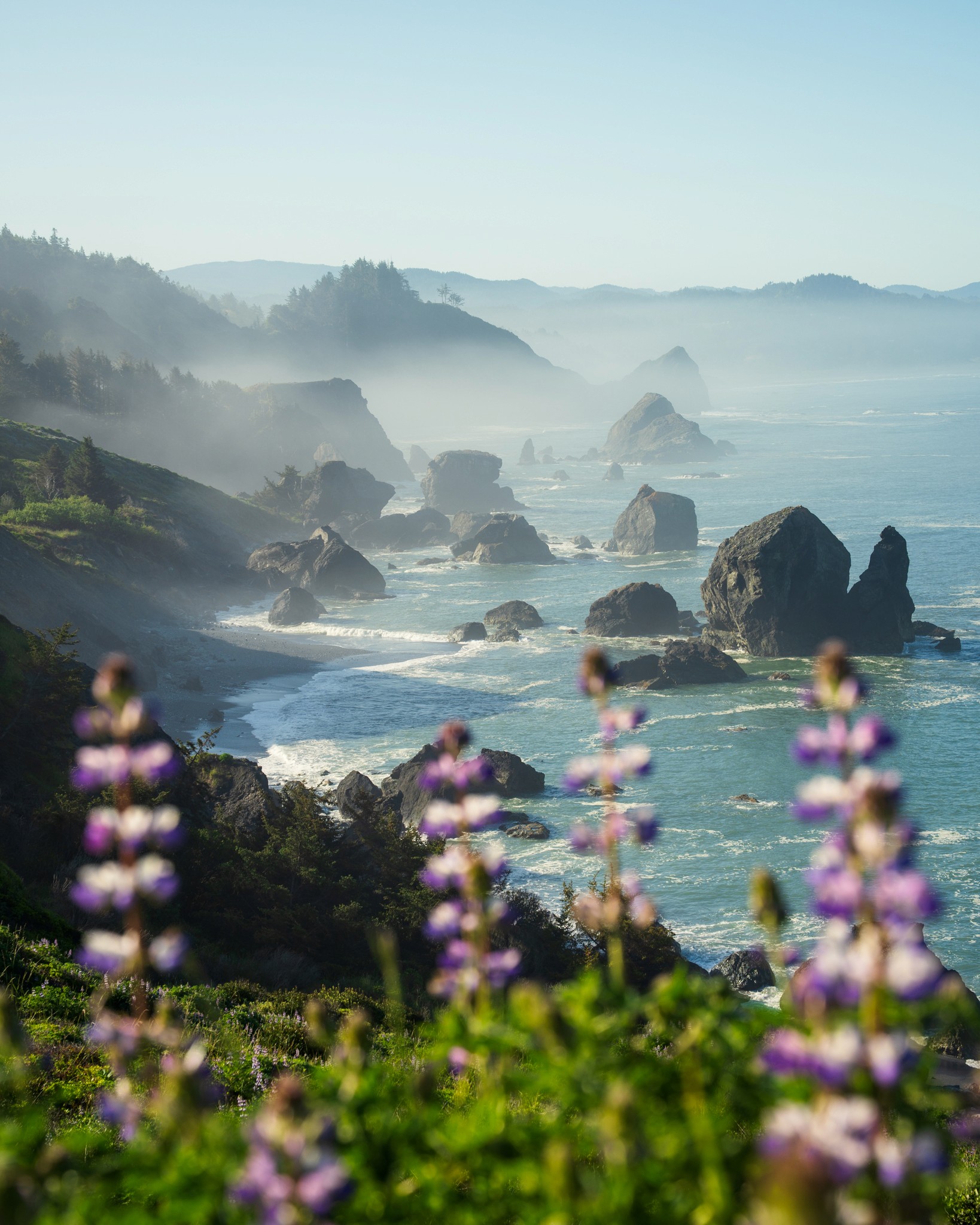 The Oregon coast is just stunning with its rugged cliffs, wide sandy beaches, and endless expanse of the Pacific Ocean. Waves crash against the weathered rocks, shaping them into fascinating formations over countless years, while massive sea stacks stand proudly in the deep blue waters. Mornings often bring a gentle mist that adds a touch of magic to the coastline, making it feel like something out of a dream. And when the sun sets, the sky turns into a masterpiece of oranges and pinks, casting a peaceful glow over the rugged terrain, reminding us of nature's incredible beauty.